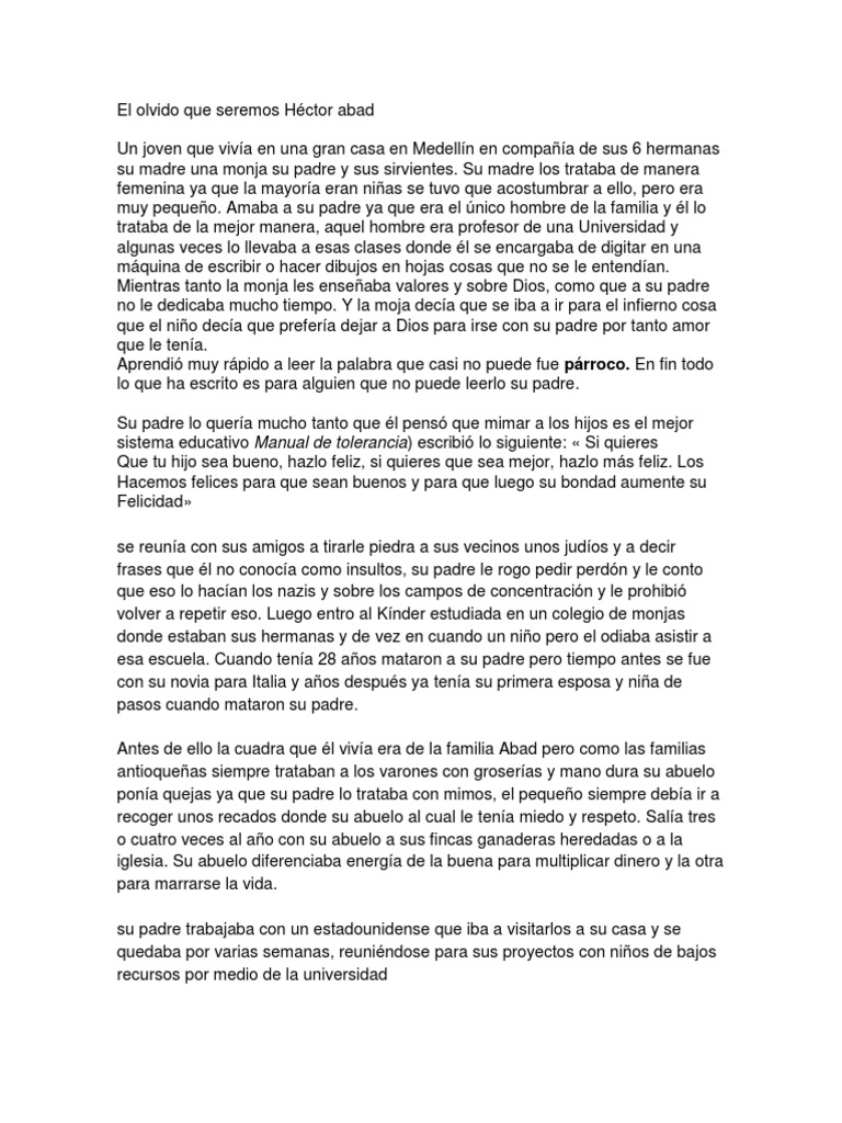 Archivo de noticias en colombia y el mundo sobre el olvido que seremos. El mérito es de abad faciince no de borges. Resumen e la pagina 15 el olvido que seremos. Noticias destacadas de el olvido que seremos. Publicada en noviembre de 2005 por la editorial planeta, para finales de ese año se había reimpreso ya en tres ocasiones y en los años sucesivos alcanzó más de cuarenta ediciones y más de 200 mil. Libro gratis es una de las tiendas en línea favoritas para comprar el olvido que seremos resumen por capitulo a precios mucho más bajos de lo que. En el olvido que seremos, héctor abad faciolince narra el asesinato de su padre, héctor abad gómez en medellín en 1987. El olvido que seremos primer corto resumen presentado por: El olvido que seremos, (seix barral, españa, 2017), ¿cómo no se me había ocurrido antes acercarme a su lectura? Jasson esteban gualguan guzman facultad de 2. Javier cámara, daniela abad, aída morales and others. Read 1,147 reviews from the world's largest community for readers. 1 el olvido que seremos: